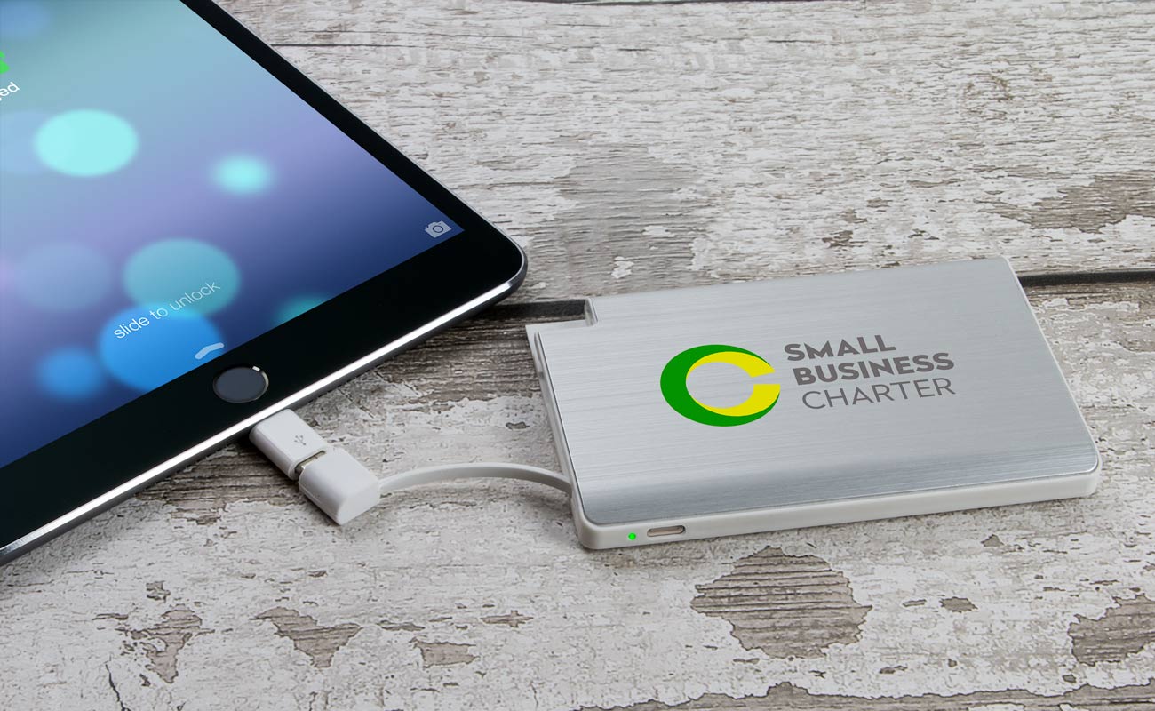Volt Powerbanken kan silketrykkes eller lasergraveres på begge sider med dit logo, slogan, hjemmeside, om den næste begivenhed og meget mere. Med et Micro USB-stik, lynadapter og en USB-C-adapter er Volt Powerbanken det perfekte tilbehør for dine kunders og medarbejderes smartphones og tablets.